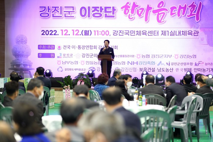 [강진=정찬남 기자] 전남 강진군이 2022년 한 해 지역주민들의 복지와 현장의 민원 해소를 위해 군정의 가교역할까지 수고를 마다하지 않았던 관내 11개 이장단의 노고를 격려하기 위해 ‘제13회 강진군 이장단 한마음 축제’를 지난 12일 강진국민체육센터 제1실내체육관에서 개최했다.