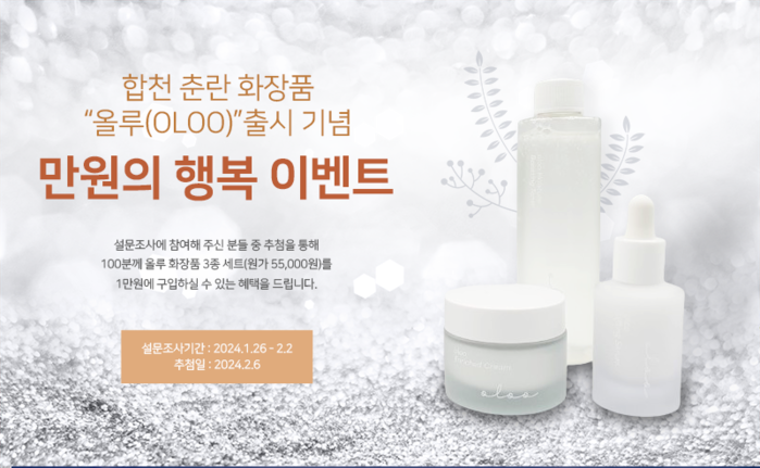 합천유통 관계자는 “국내 최초 춘란 성분을 활용한 화장품 개발 및 출시를 기념해 이번 이벤트를 준비했다”며 “화장품 올루와 함께 합천춘란의 매력을 알리는 이벤트가 될 것으로 기대한다”고 말했다.