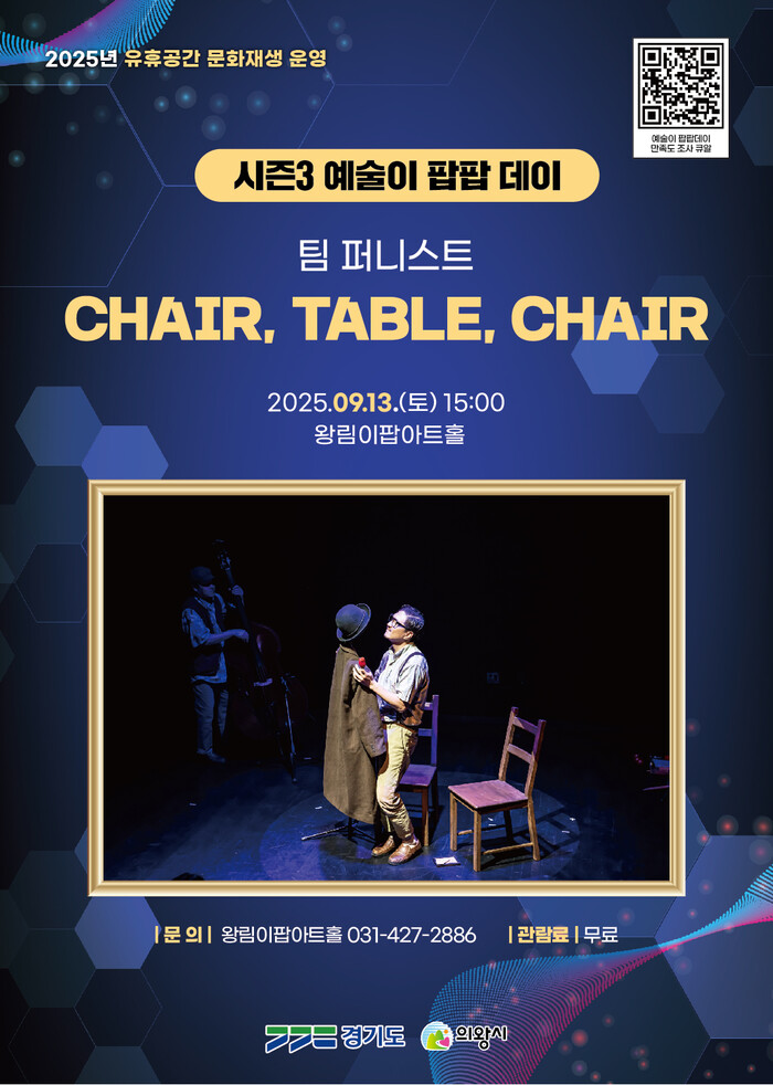 | ▲ 의왕시 오는 9월 13일(토) 오후 3시 왕림이팝아트홀에서 팀 퍼니스트의 넌 버벌(Non Verbal) 퍼포먼스『CHAIR, TABLE, CHAIR』공연 안내 포스터 /자료제공=의왕시 |