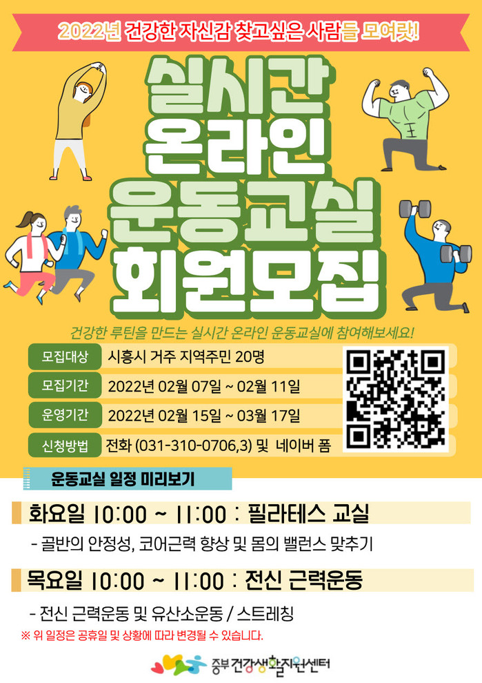 시흥시 보건소 관계자는 “코로나19로 활동량이 부족해진 시민들이 운동을 통해 스트레스를 해소하길 바라며, 앞으로도 안전한 건강증진 서비스를 제공하는 데 힘쓰겠다”고 말했다.