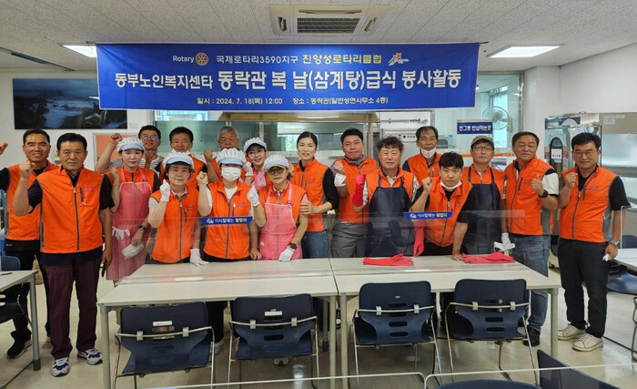 국제로타리 3590지구 진양성로타리클럽(회장 정주영) 회원들은 18일 일반성면 동락관 내 식당에서 어르신 300여 명에게 삼계탕을 제공하며 지역 어르신들의 건강한 여름나기를 기원했다.