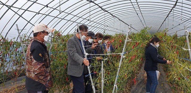 | ▲ 해남군농업기술센터, 송지면 시설고추 농가 시설고추 방제시스템 보급 시범사업 현장 평가회 개최 / 사진=해남군 제공 |
