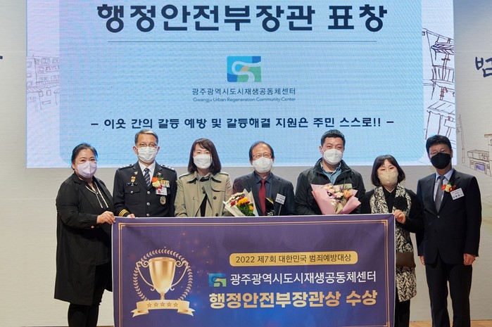 [광주=정찬남 기자] 광주광역시 도시재생공동체센터는 지난 ‘2022 제 7회 대한민국 예방대상대상’에서 지역의 다양한 주체가 참여하는 공동체 치안 부문에서 최우수로 행안부장관상을 수상했다. ‘대한민국 범죄예방대상’ 은 2016년부터 매년 지역사회 범죄예방에 공헌한 기관· 단체 등 우수 범죄예방 정책 및 활동 사례를 선정해 시상하는 상이다.