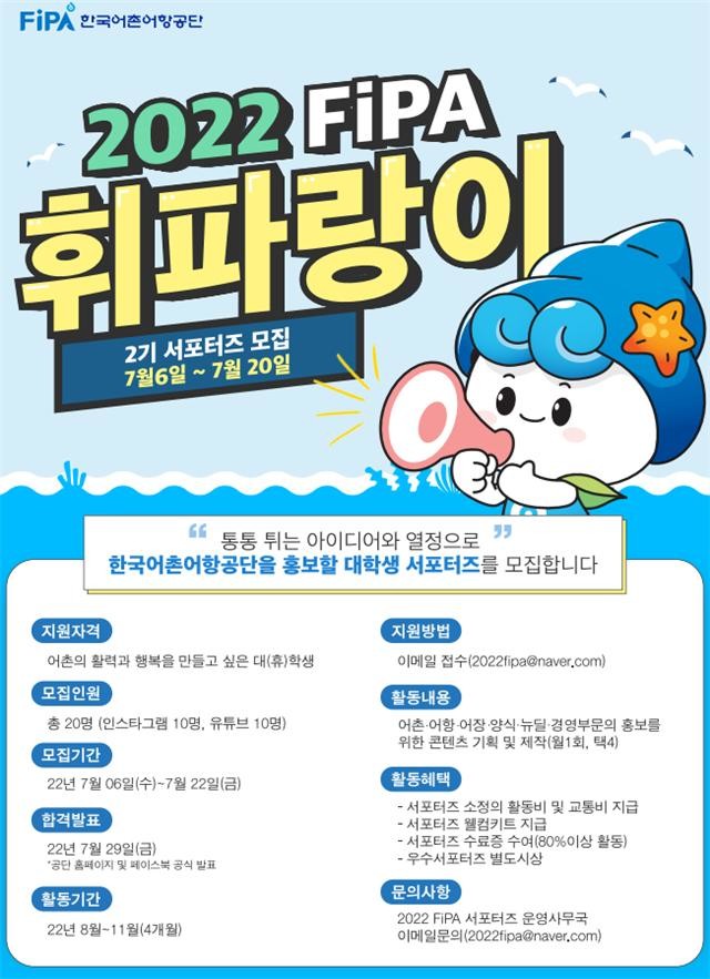 한국어촌어항공단(이사장 박경철, 이하 공단)은 7월 6일(수)부터 20일(수)까지 통통 튀는 아이디어와 열정으로 공단을 널리 알릴 ‘2022년 FiPA 서포터즈(휘파랑이 2기)’를 모집한다.