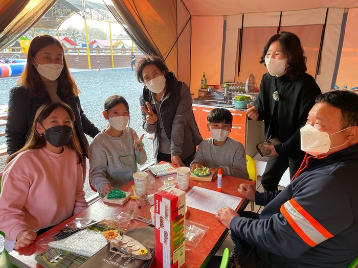 이번 캠프는 초등학생 가구 대상으로 초동면에 소재한 키즈글램핑에서 진행됐다. 코로나19 방역수칙에 따라 가족끼리 텐트에서 가족체험키트와 프로그램 체험을 하고, 배부된 밀키트로 식사를 함께 나누며 오붓한 시간을 가졌다.