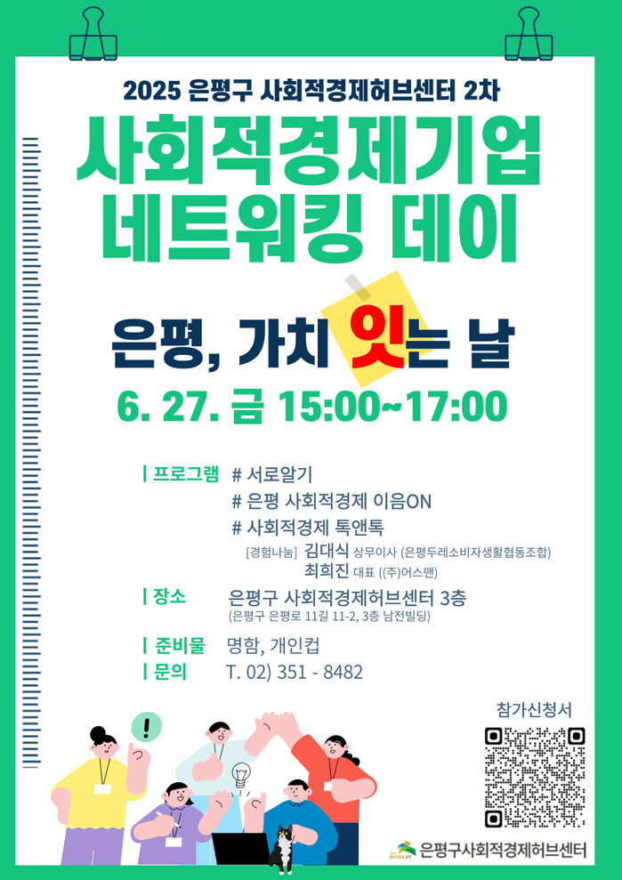 [시민일보 = 이대우 기자] 은평구(구청장 김미경)가 오는 27일 은평구사회적경제허브센터에서 ‘사회적경제기업 네트워킹 데이’를 개최한다고 밝혔다.