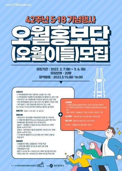 오월홍보단 지원 자격은 5·18민중항쟁 정신을 계승하고 청년활동가로 활동하고 싶은 사람, 제42주년 기념행사 홍보와 참여를 유도할 수 있는 사회관계망(SNS) 매체를 활용할 수 있고, 글씨기와 사진촬영이 가능한 개인블로그, 유튜브 등을 운영하는 개인이며, 각각의 활동에 따른 활동비가 지급된다.