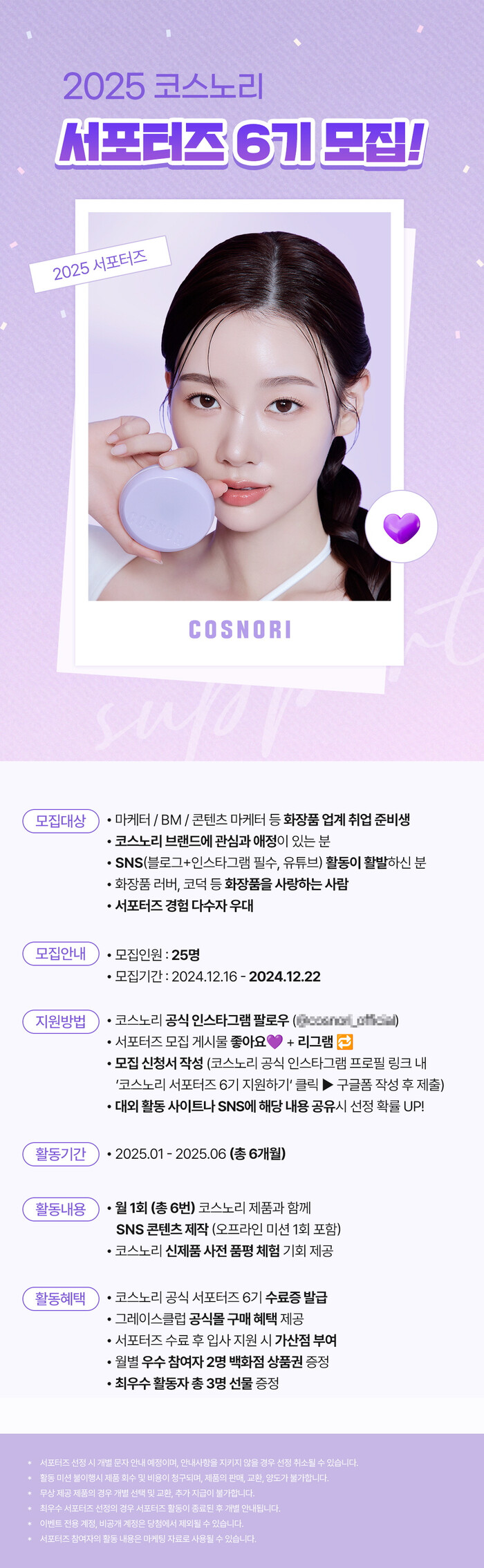 서포터즈 모집대상은 활발한 SNS 활동을 하고, 코스노리 브랜드에 애정과 관심이 있는 누구나 지원할 수 있다.