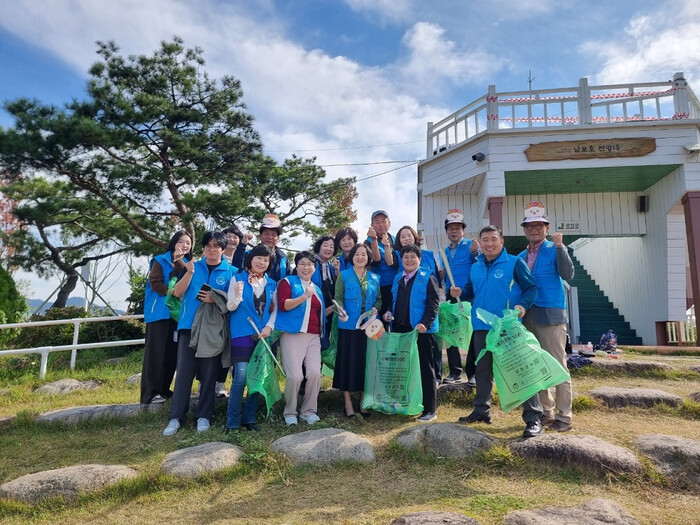 | ▲ 강진군자원봉사단체협의회가 강진만생태공원 입구에서 환경정화활동에 앞서 기념촬영 / 강진군 제공 |