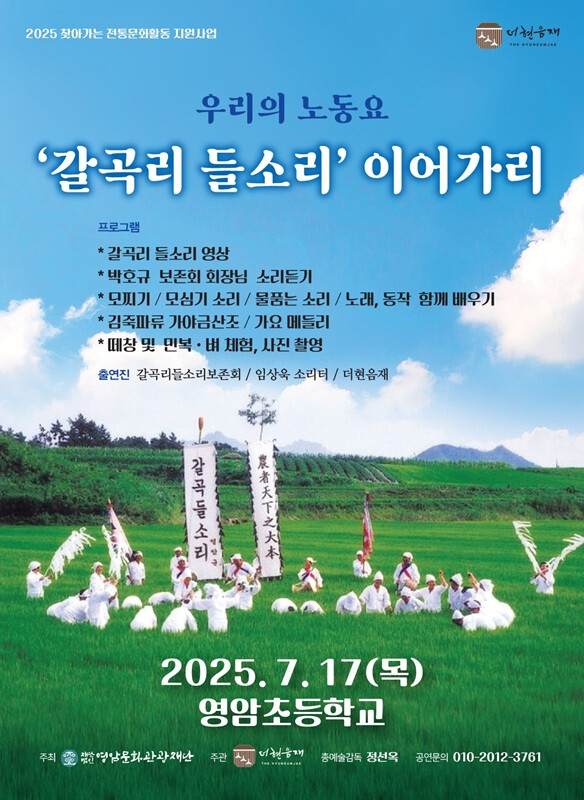 작년에 이어 진행되는 행사는 더현음재를 중심으로 갈곡리들소리보존회와 소리터(대표: 임상욱)가 함께 연합하여 영암 초등학교 학생들을 대상으로 프로그램을 진행한다.