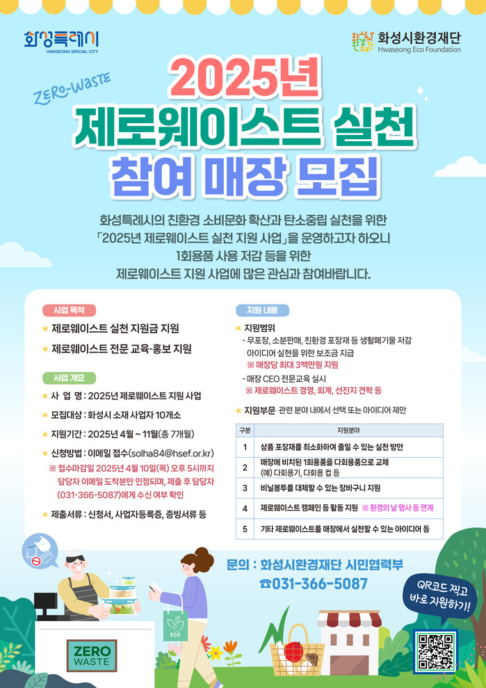 [화성=송윤근 기자] 경기 화성시환경재단이 오는 10일까지 1회용품 사용 저감 등의 친환경 소비 문화와 탄소중립 실천 확산을 위해 ‘2025년 제로웨이스트 실천 지원 사업’에 참여할 매장을 모집한다.