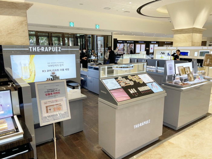 뿐만 아니라 MZ세대를 더욱 공략할 수 있는 H&B 스토어 입점도 가속화하고 있다. 더 라퓨즈는 현재 시코르에 입점했다. 최근 쿠션과 립스틱 등 메이크업 라인을 출시한 「더 라퓨즈 (THE RAPUEZ)」 의 제품 경험을 더욱 촉진할 수 있는 오프라인 채널이다.