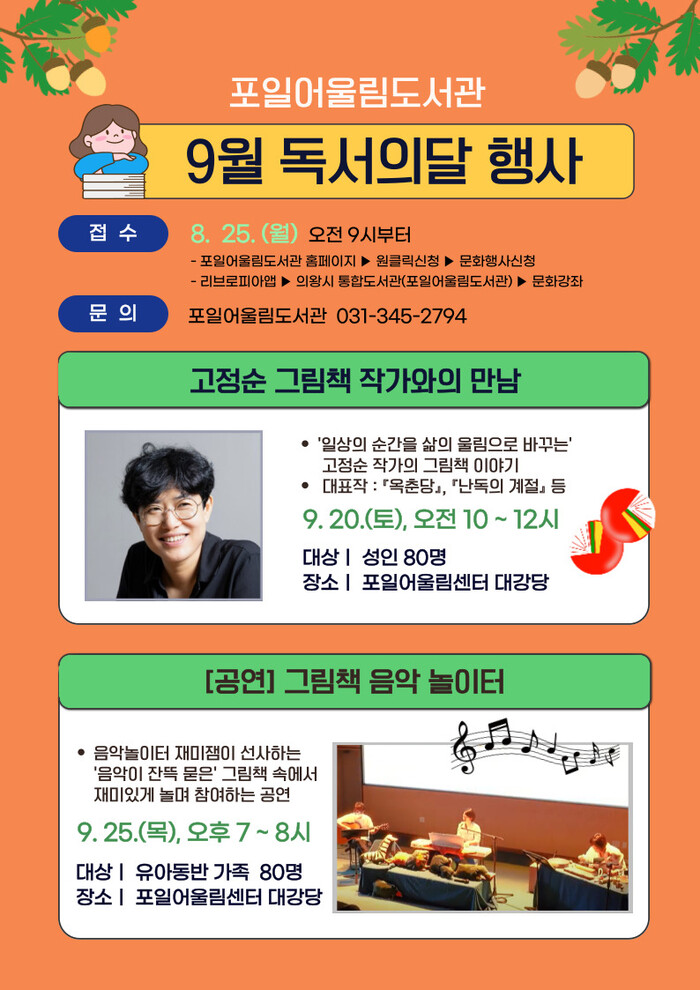 아울러, 독서의 달 행사는 9월 20일과 25일에 열린다. 20일에는 「옥춘당」, 「난독의 계절」을 쓴 고정순 작가와의 만남이 예정돼 있으며, 이 강연회에서는 일상의 순간을 따뜻한 시선으로 담아내는 작가의 그림책 집필 과정을 직접 들을 수 있다. 25일에는 그림책, 노래, 악기 체험이 결합 된 체험형 공연 ‘그림책 음악 놀이터’가 진행돼 어린이들의 상상과 감각을 깨우는 특별한 시간을 선사할 예정이다.