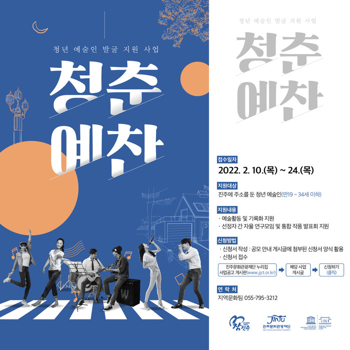 진주문화관광재단은 지역에서 활동하는 청년예술인을 대상으로 2022년 청년예술인 발굴 지원사업 ‘청춘예찬’공모 참여자를 오는 2월 24일까지 신청·접수한다.