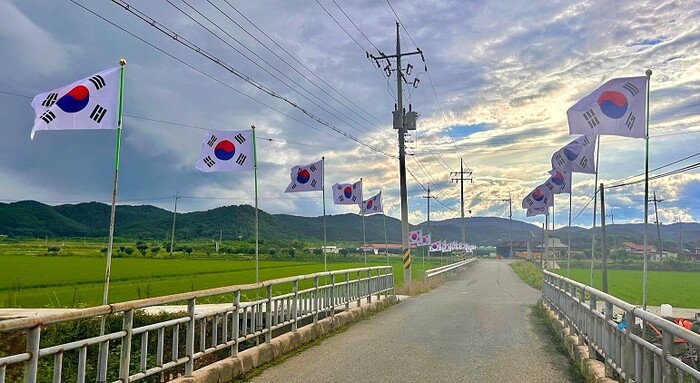 주민들은 자주 이용하는 남유마을 다리 난간에 30여 개의 태극기를 직접 설치해 태극기 다리를 조성했다.