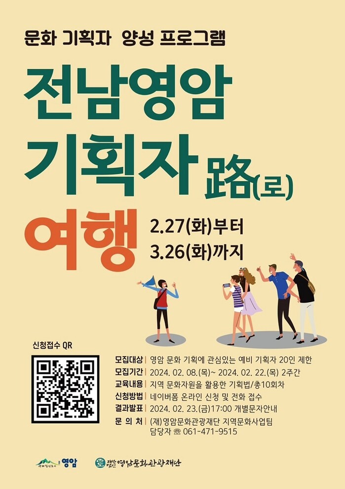 ‘기획자路(로) 여행’신청은 오는 22일(목) 오후 6시까지며, 영암에서 문화 기획을 꿈꾸는 누구나 참여 가능하며 네이버폼 온라인 링크를 통해 신청하거나 영암문화관광재단 지역문화사업팀으로 전화 접수하면 된다.