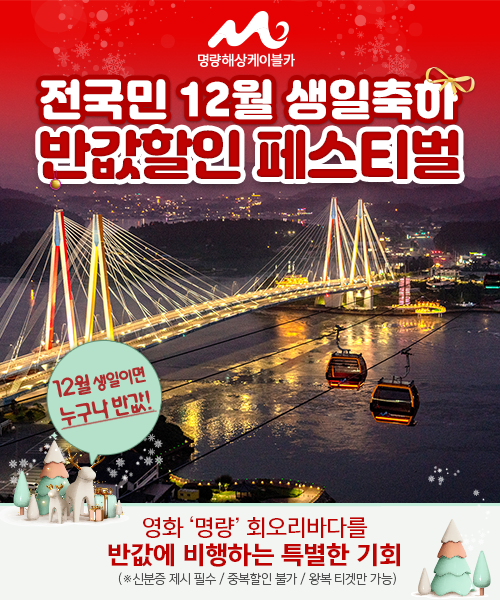 12월 딱 한달 동안 12월에 생일인 고객을 대상으로 정상 요금의 50% 할인된 금액(일반캐빈 6,500원/크리스탈 캐빈 8,500원 – 대인 왕복 기준, 중복할인 불가)으로 할인을 한다고 밝혔다. 할인 혜택을 받기 위해서는 티켓팅 시 신분증만 제시하면 된다.