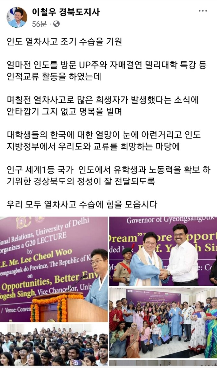이철우 지사는 4일 페이스북에 글을 올리고 “얼마 전 인도를 방문해 UP주와 자매결연 델리대 특강 등 인적교류 활동을 했는데 며칠 전 열차사고로 많은 희생자가 발생했다는 소식에 안타깝기 그지없다”며 명복을 빌었다.