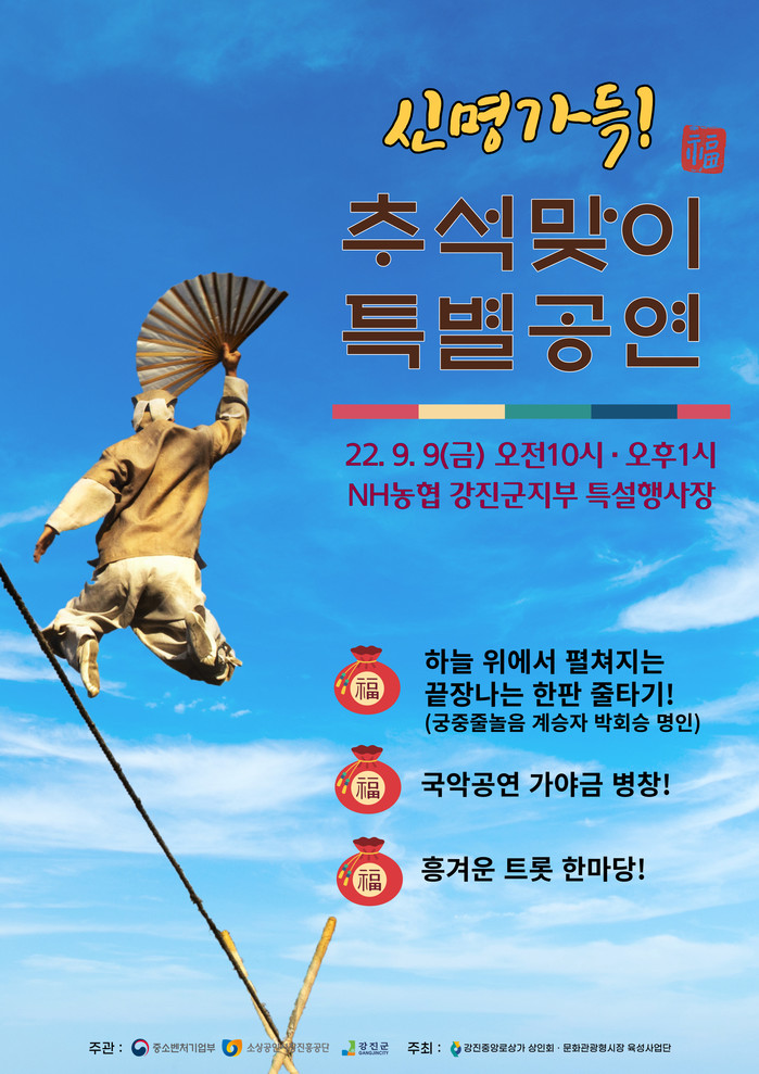 이번 외줄타기 특별공연은 오전 10시와 오후 1시 농협은행 강진군지부 주차장 특설행사장에서 총 2회로 진행되며, 중간에 가야금 병창과 트롯 한마당 등 흥겨운 공연도 준비돼 있다.