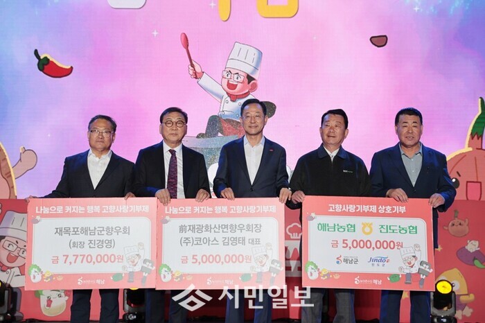 축제에서는 해남에 대한 애정을 가득 담아 고향사랑기부금과 장학사업기금 기탁도 이뤄졌다. 김영태 전 재광화산향우회장이 고향사랑기부금 500만 원, 진경영 재목해남향우회장이 777만 원, 해남농협과 진도농협에서 상호기부를 통해 500만 원을 기탁했다.