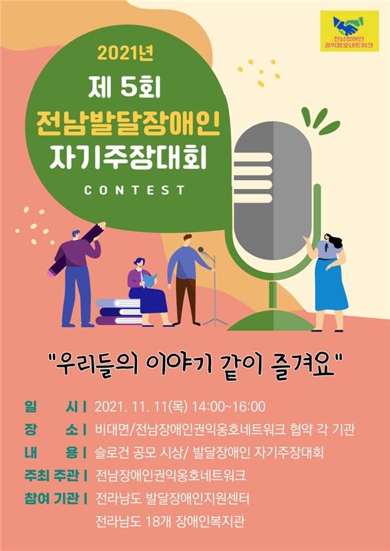 전남장애인권익옹호네트워크(도내 장애인복지관 18곳, 전라남도발달장애인지원센터)는 오는 11일(목) 오후 2시 슬로건 “우리들의 이야기 같이 즐겨요”를 외치며 ‘제 5회 전남 발달장애인 자기주장대회’를 개최한다.