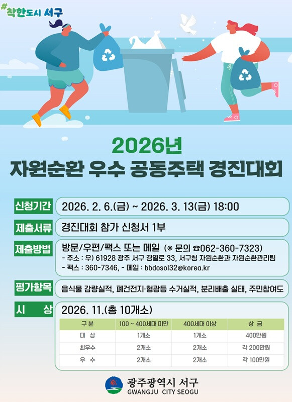 참여를 희망하는 공동주택은 3월13일까지 서구청 누리집 공지사항의 관련 서류를 준비해 서구청 자원순환과에 방문하거나 전자우편 등으로 제출하면 된다. 서구는 3월 중 참여자 대상 사업설명회를 열어 경진대회 추진 절차와 실적 평가 기준 등 자원순환 실천 방안을 안내할 예정이다.