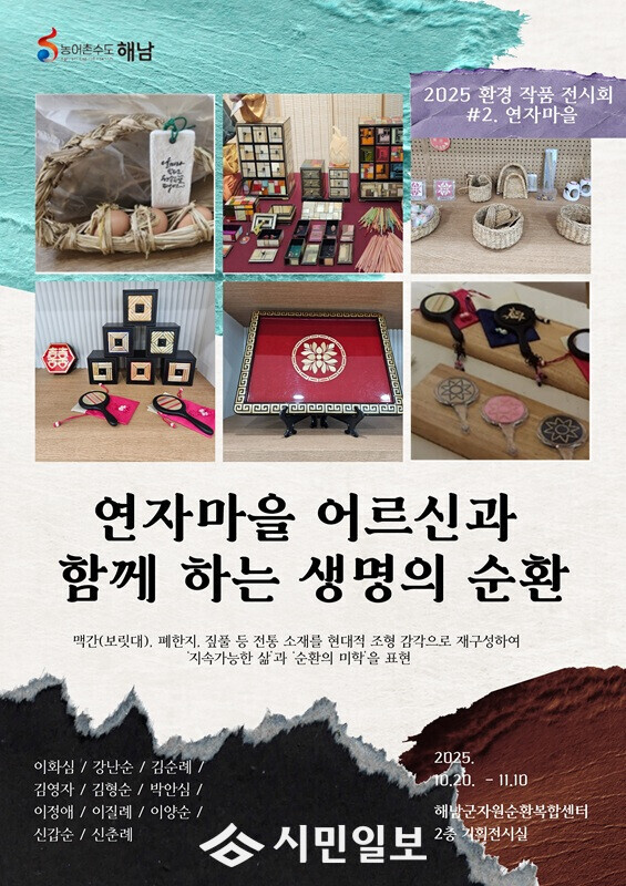 이번 전시는 황산면 연자마을 어르신 11명이 참여한 공동 작품전으로, 버려지는 농가 부산물과 전통 재료를 활용해‘순환’과‘지속가능한 삶’을 주제로 한 창작 작품들을 선보인다.