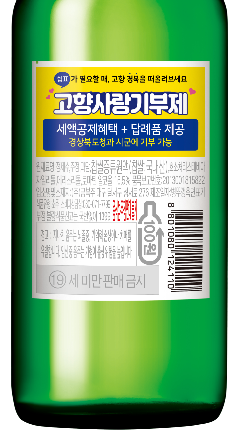 김종수 경북도 자치행정국장은 “오랜 세월 영남의 대표 소주로 자리매김하고 있는 ‘깨끗한 아침, 참’에 홍보 라벨이 부착되면 고향사랑 기부제 활성화에 큰 도움이 될 것”이라며 “고향사랑기부제가 지방재정을 확충하고 지역경제 활성화에 기여할 수 있도록 앞으로도 다양한 홍보 방안 모색에 노력하겠다”라고 밝혔다.