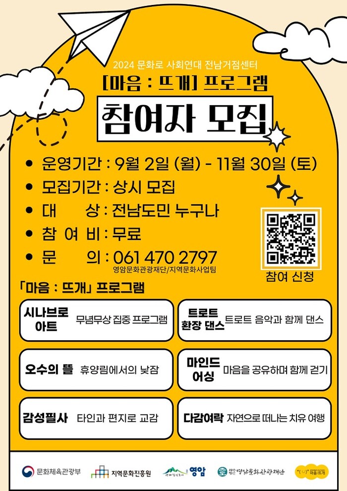 2024 문화로 사회연대 전남거점센터를 운영 중인 재단의‘마음:뜨개’프로그램은 ▲혼자 혹은 여럿이 모여 예술을 창작하는‘시나브로 아트’ ▲한국트로트가요센터에서 신나는 음악에 맞추어 무대 위에서 다같이 춤추는‘트로트 환장댄스’▲전남의 산림 휴양지에서 쾌적한 자연 속 낮잠을 즐기는‘오수의 뜰’▲전남지역에 조성된 황톳길을 처음 마주하는 사람들과 함께 걸으며 마음을 공유하는‘마인드 어싱’▲타 지역에 사는 사람들과 일상을 공유하는 편지 나누기‘감성필사’▲사는 곳을 잠시 떠나 전남의 매력을 새롭게 발견하는 여행‘다감여락’ 프로그램으로 11월 말까지 수시로 모집하여 운영되며 참가비는 무료이다.
