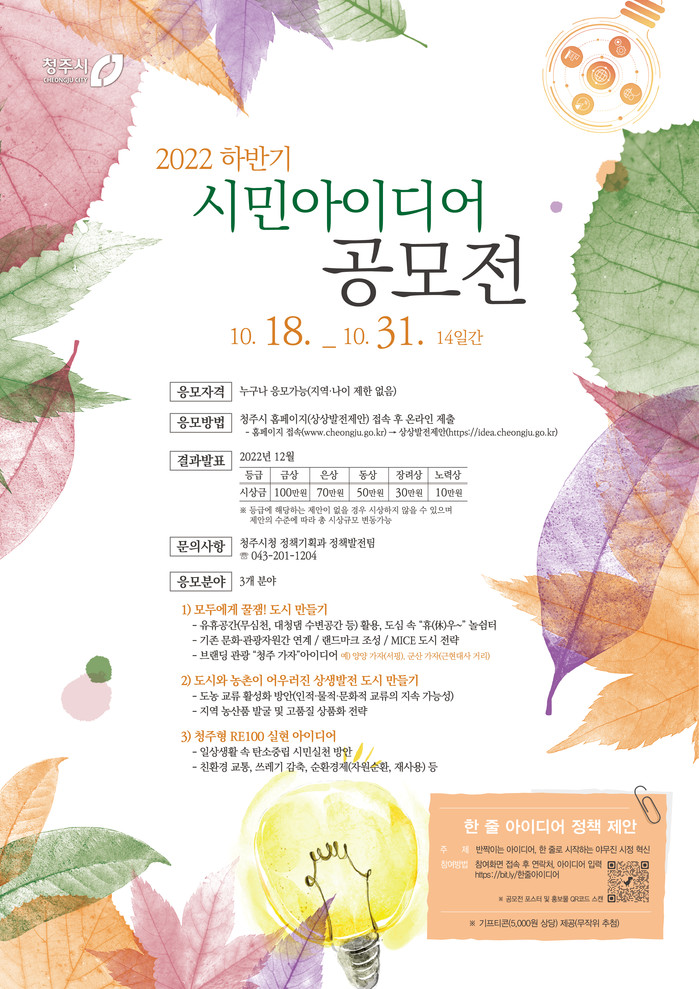 공모는 ▲모두에게 꿀잼! 도시를 위한 아이디어 ▲도농 상생발전 도시 만들기 ▲청주형 RE100 실현 방안 등 3가지 분야로 진행되며, 지역과 나이 제한 없이 누구나 응모 가능하다.