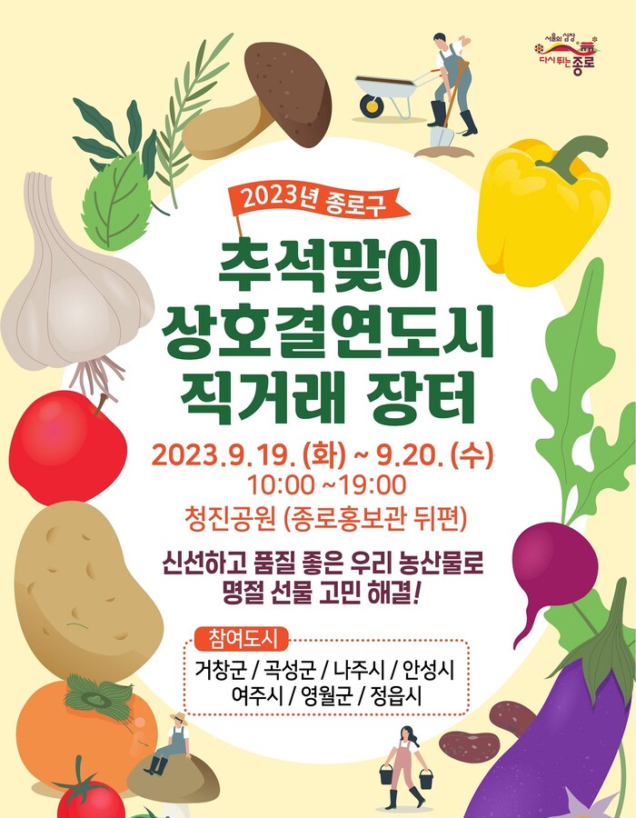 직거래 장터 참여도시는 ▲거창군 ▲곡성군 ▲나주시 ▲안성시 ▲여주시 ▲영월군 ▲정읍시 등 종로구 상호결연도시 가운데 참여를 희망한 7개 도시다.