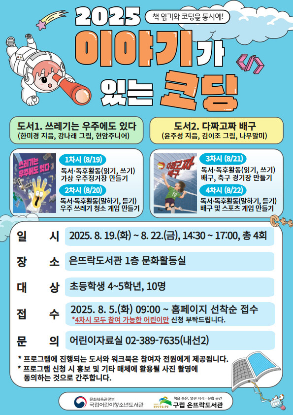 [시민일보 = 이대우 기자] 서울 은평구(구청장 김미경)는 구립 은뜨락도서관에서 국립어린이청소년도서관이 주최하는 ’이야기가 있는 코딩‘ 공모사업에 선정돼 초등학생을 대상으로 독서 연계형 코딩 수업을 운영한다고 밝혔다.