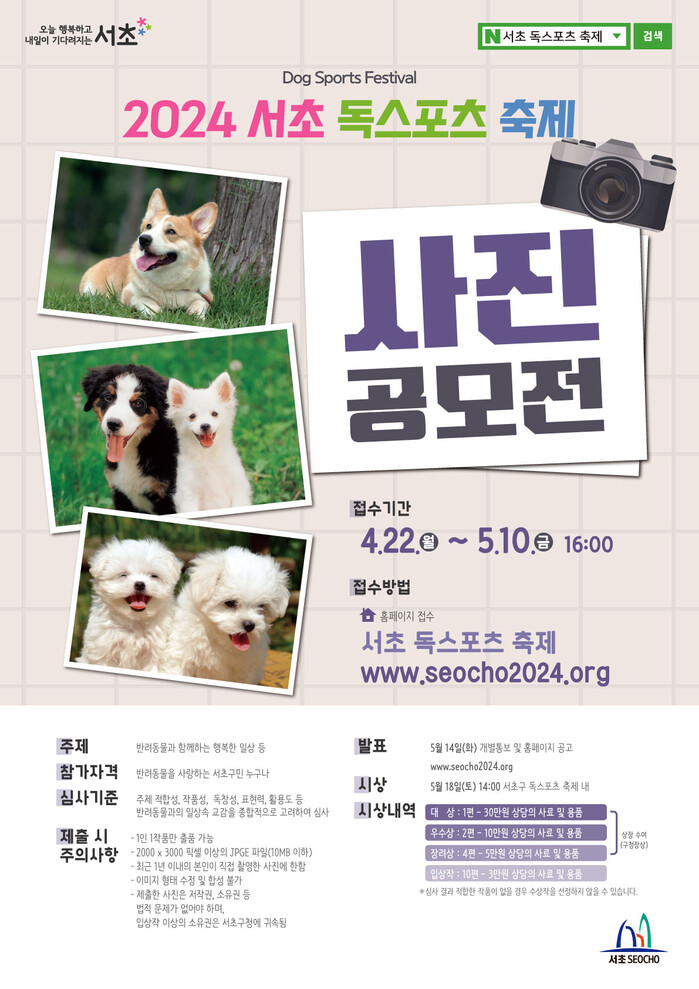 전성수 구청장은 “사진 속에 담긴 반려동물과의 소중한 일상과 추억들을 함께 기억하고 공유함으로써, 건강하고 성숙한 반려동물 문화가 정착될 것으로 기대한다”며 “올해 5월 18일 개최되는 반려견 축제인 ‘2024 서초 독 스포츠 축제’에도 많은 참여와 관심을 바란다”고 말했다.