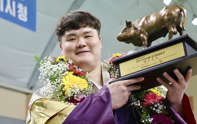 | ▲ 2021 민속씨름 문경왕중왕전에서 백두급 장사에 등극한 장성우 영암군민속씨름선수단 소속 장사 / 사진=영암군 제공 |