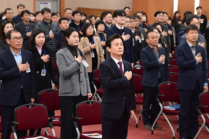 진주시는 2일 시청 시민홀에서 새해 시무식을 갖고 2024년을 맞이하여 힘찬 각오를 다졌다.