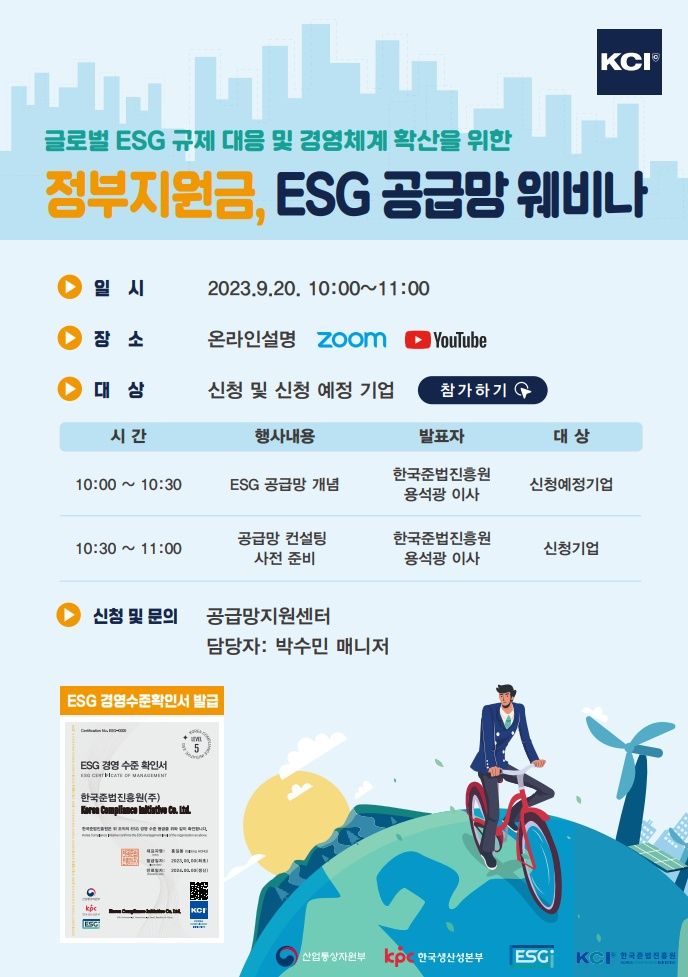 온라인 설명회는 9월 20일(수) 오전 10시부터 11시까지 진행되며 ▲ESG공급망 개념 ▲공급망 컨설팅 사전 준비에 대한 내용으로 이루어질 예정이다.