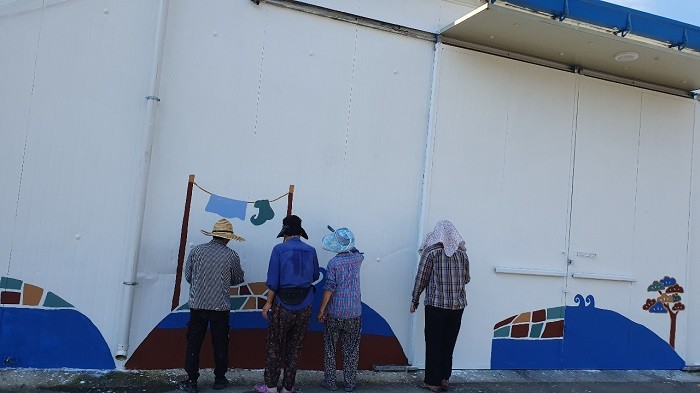 | ▲ 군동면 안풍마을 주민들이 "2022년 청정 전남 으뜸마을 만들기 사업"에 참여하며 마을 공용창고에 벽화 그림 작업을 하고 있다. / 사진=강진군 제공 |