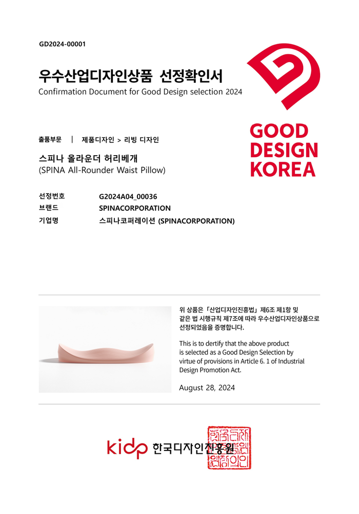 지난 8월 발표된 우수디자인(GD)상품선정에서 주목을 받은 '스피나 올라운더 바디코렉터 허리베개'는 산업통상자원부가 주최하고 한국디자인진흥원이 주관하는 이 프로그램의 심사에서 디자인의 우수성을 인정받았다. 해당 제도는 1985년부터 시작되어 매년 시행되며, 디자인 품질이 뛰어난 제품에 GD 마크를 부여해 왔다.