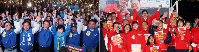 여야에 따르면 한 위원장은 공식 선거운동 13일 동안 총 4135.6㎞를 이동하며 136개 선거구 지원 유세에 나섰고 이 대표는 지난달 11일부터 한 달간 직선거리 기준 6908㎞를 누비며 66곳을 찾았다. 이 중 한동훈 위원장은 91곳(67%)을, 이재명 대표는 47곳(71%)을 수도권 일정에 투자한 가운데 최대 격전지인 '한강벨트'에 화력이 집중됐다.