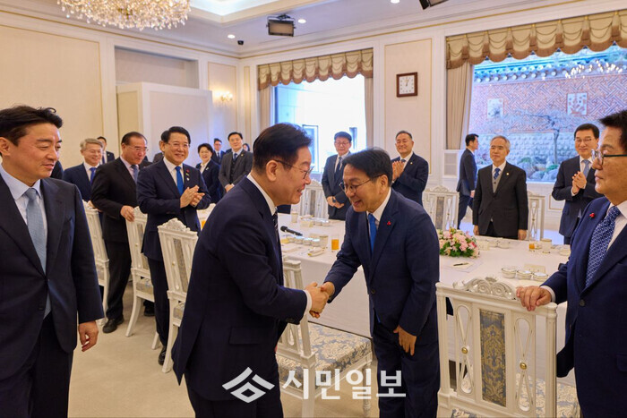 | ▲ 강기정 광주광역시장이 9일 청와대에서 열린 대통령 주재 오찬 간담회에서 이재명 대통령과 악수하고 있다. /광주광역시 제공 |