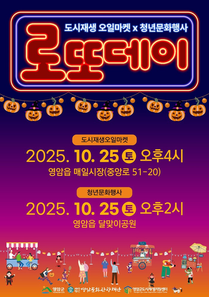 영암읍 매일시장에서는 오후 4시 ‘낭만 DJ 공연’을 포함해 다양한 문화 공연과 오일마켓, 관광객 참여 이벤트 등이 열린다.