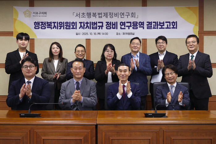 [시민일보 = 박소진 기자] 서울 서초구의회(의장 고선재) 의원연구단체인 ‘서초구 재정·입법 정책 연구회’와 ‘서초행복법제정비연구회’가 잇달아 연구용역 결과보고회를 개최하며 자치입법 품질 개선을 목표로 연구를 활발히 이어가고 있다.