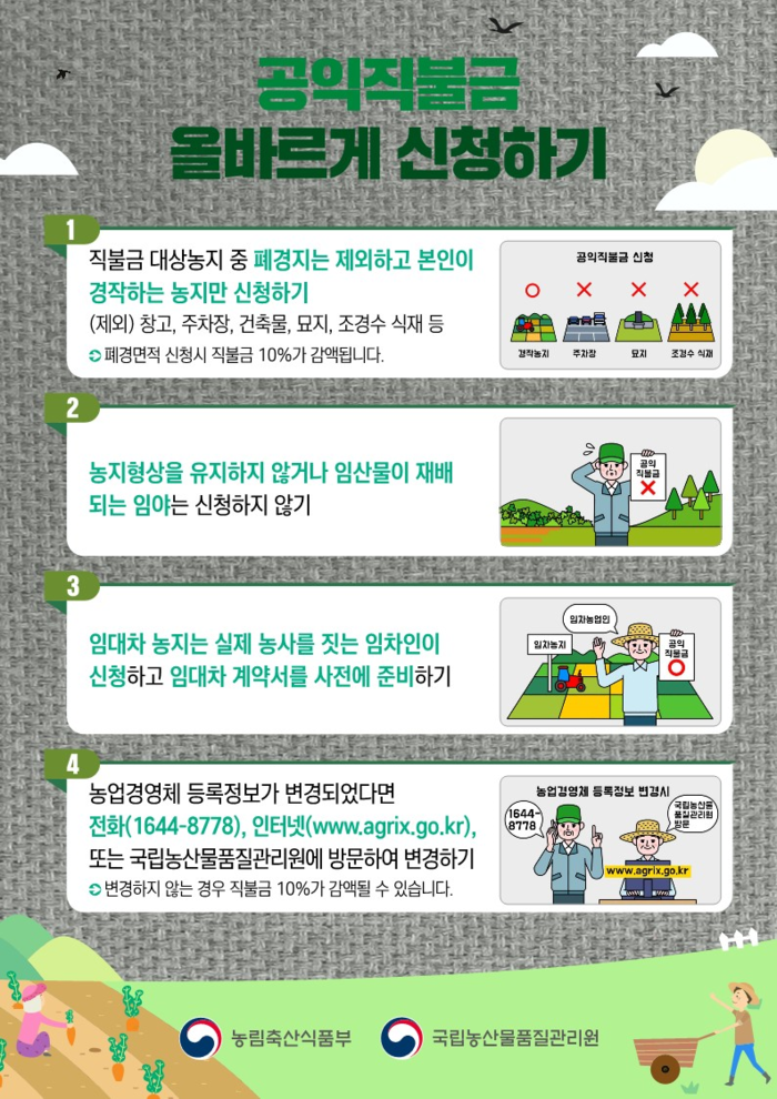 공익 직불제는 농업의 공익기능 증진과 농업인 등의 소득안정을 도모하기 위한 공익사업으로, 9월 말까지 등록대상자를 확정하고 올해 11월~12월 중 지급된다.