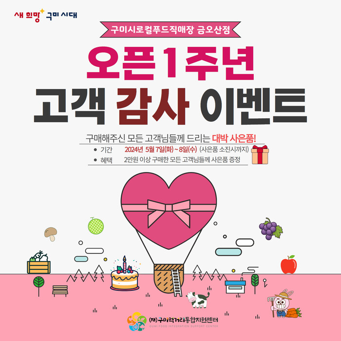 [구미=박병상 기자] 경북 구미시가 오는 5월 7일부터 8일까지 이틀간 지난 1년 동안 시민들의 큰 사랑을 받은 로컬푸드 직매장 금오산점 ‘감사의 개점 1주년 행사’를 연다.
