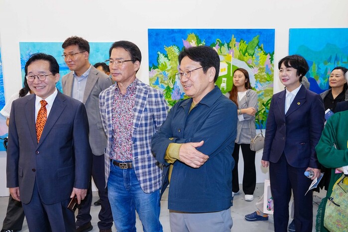 | ▲ 강기정 광주광역시장이 지난 10일 오후 서구 김대중컨벤션센터에서 열린 '제15회 광주국제미술전람회(아트광주24) 개막식'에 참석해 작품을 관람하고 있다./광주광역시 제공 |