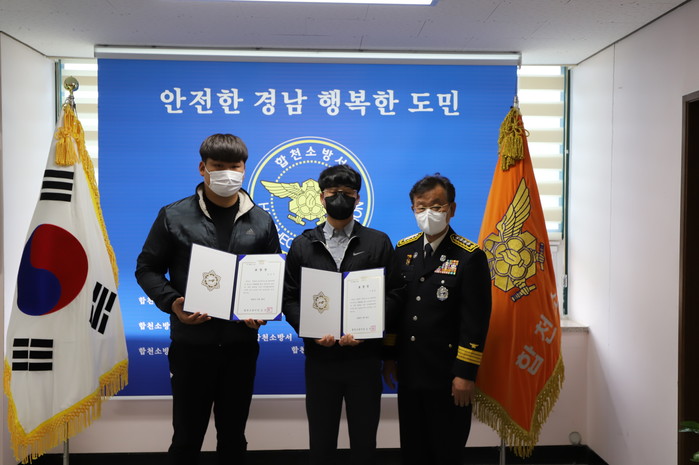 표창 수여식은 합천소방서에서 진행했으며, 유공자는 이광열(남/30세)씨, 김선우(남/21세)씨이다.