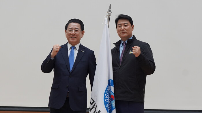 | ▲ 김영록(좌측)도지사 송진호(우측)전남도체육회장이 선수단기를 전달후 기념 포즈(사진=전ㄴ마도체육회) |