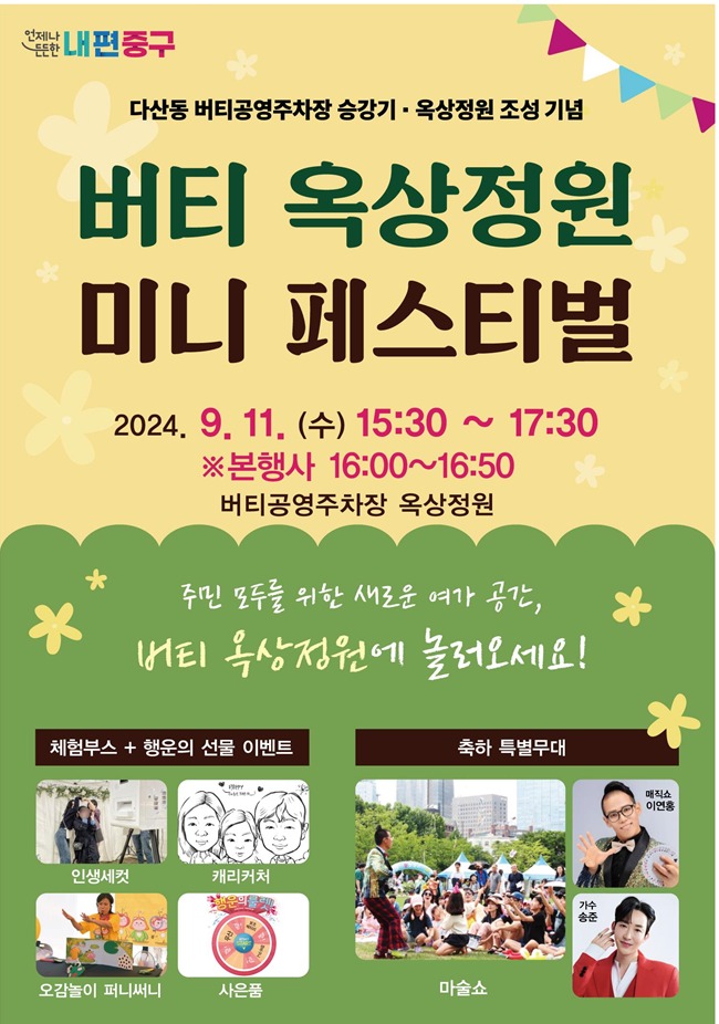 [시민일보 = 여영준 기자] 서울 중구가 오는 11일 버티공영주차장 옥상정원에서 주민들과 함께하는 특별한 미니 페스티벌을 개최한다.