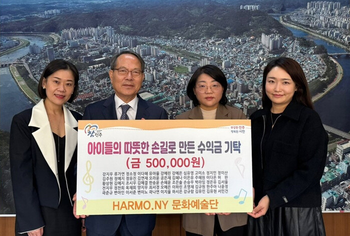 HARMO. NY 문화예술단(단장 정다정)은 관내 초등학생들의 참여로 마련한 활동 수익금 50만 원을 6일 진주시복지재단(이사장 이성갑)에 기탁했다.