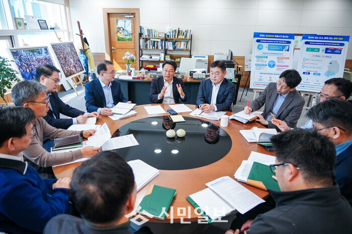 | ▲ 강기정 광주광역시장(사진 가운데)이 13일 오전 시청 집무실에서 광주전남행정통합실무준비단과 관련 부서 간부들이 참석한 가운데 점검회의를 열어 통합특별시 출범 준비 상황을 보고받고 주요 과제별 추진 상황을 점검하고 있다. /광주광역시 제공 |